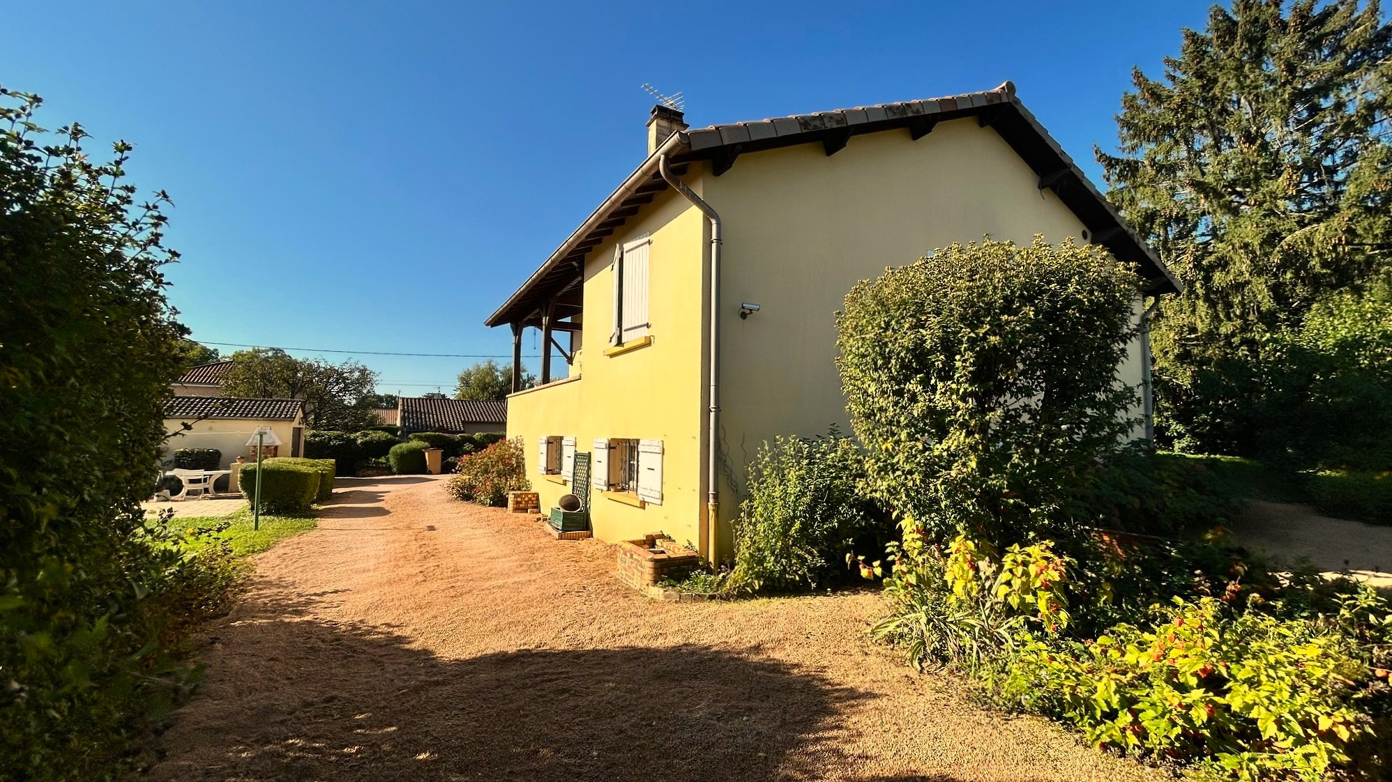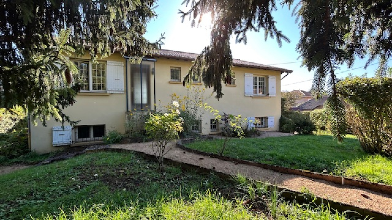Le rez-de-chaussée est légèrement semi-enterré avec accès de plain-pied par le pignon situé au Sud, aménagé en partie habitable, par la galerie Mâconnaise ou par l'entrée pricipale située à l'ouest.