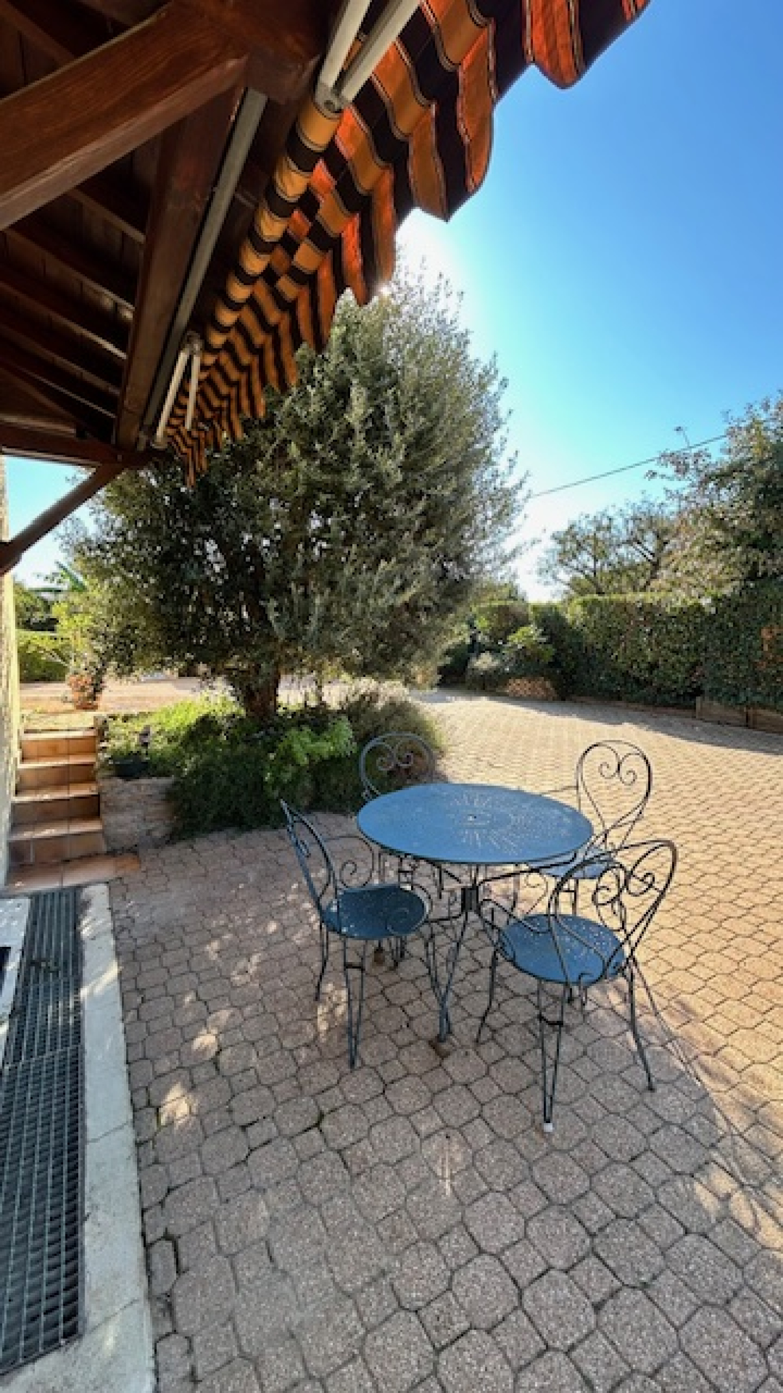 La cour d’accueil est pavée, elle permet de contourner l’habitation.