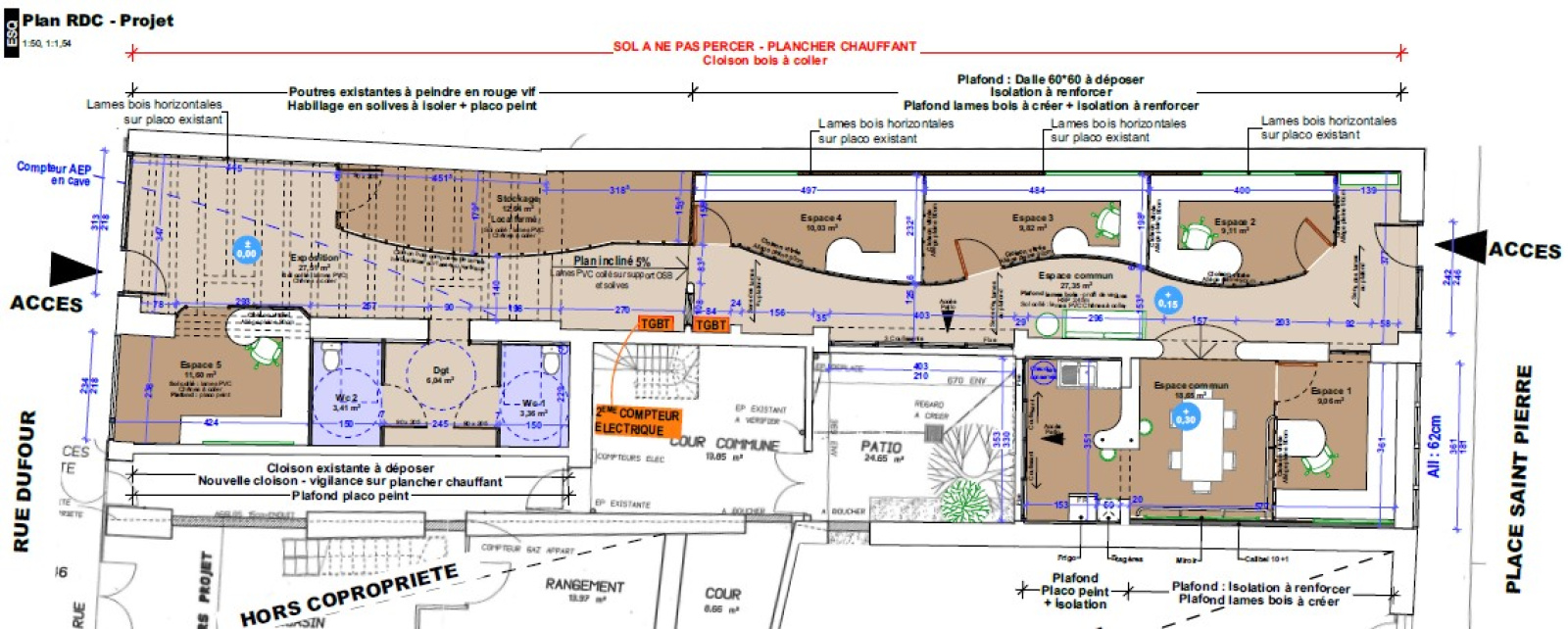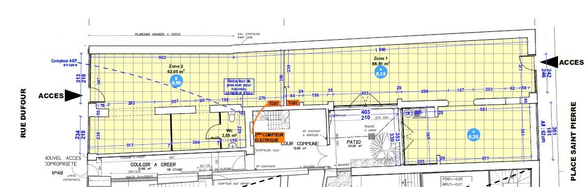 - possibilité de diviser en 2 espaces distincts : 65,60 m2 rue Dufour et 86,81 m2 Allée saint Pierre.