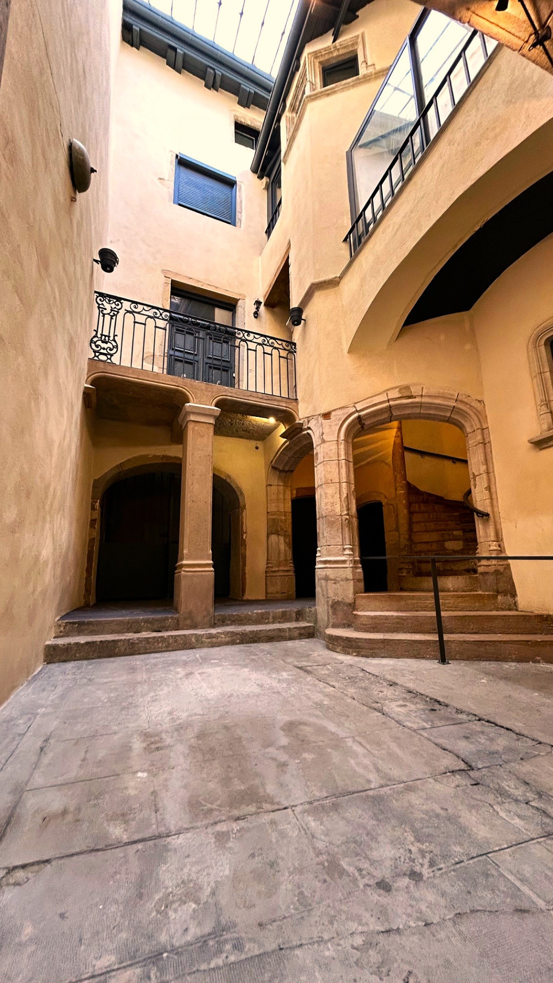 En son rez-de-chaussée, sous son porche et dans sa cour intérieure abritée, puis dans sa cour close à l'arrière :